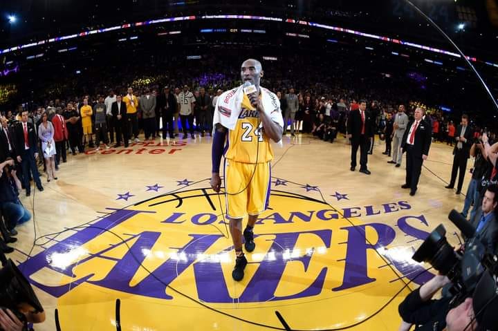 Kobe Bryant addressing the Staples Center (now called Crypto.com Arena) on April 16, 2017 after his last NBA game. He scored 60 points.